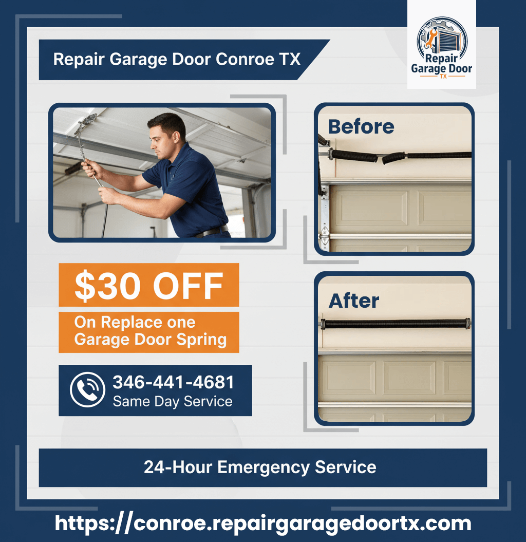 These small changes compound over time causing the door to feel heavier, move more slowly or drift unevenly. Without correction at Repair Garage Door Conroe TX daily use turns normal wear into mechanical strain that affects the entire system.